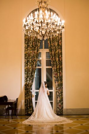 Muito clássica, Nathália já tinha todo o casamento planejado na mente e sonhava com uma noite digna de princesa, com direito à cerimônia na igreja e recepção em um belo salão. Junto com a cerimonialista Lela, da Lela Eventos, e a decoradora Eugenia Guerrera, o casal foi, aos poucos, idealizando seu casamento tradicional tendo como cenário o icônico Museu Histórico Nacional, um dos espaços mais celebrados do Rio de Janeiro. Ao lado da decoradora, Nathália abandonou a tradicional paleta em tons de branco e verde para ousar um pouco mais e abraçar um projeto moderno e elegante em tons marsala, dourado e champanhe – valorizando a natureza rústica do salão. E enquanto a família e o noivo decidiam alguns detalhes, a noiva foi em busca de seu vestido dos sonhos e o encontrou no trabalho da estilista Carol Hungria, que assinou um modelo rendado com decote em V e mangas compridas transparentes – um look bridal digno de princesa finalizado com grinalda, terço e maquiagem em tons de nude por Marcelo Hicho.